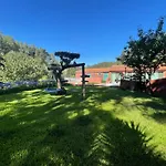 En kokvrå finns på lägenheten. Den har en terrass med utsikt över bergen.